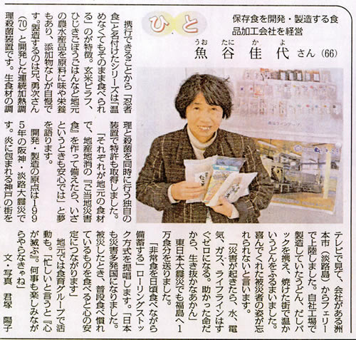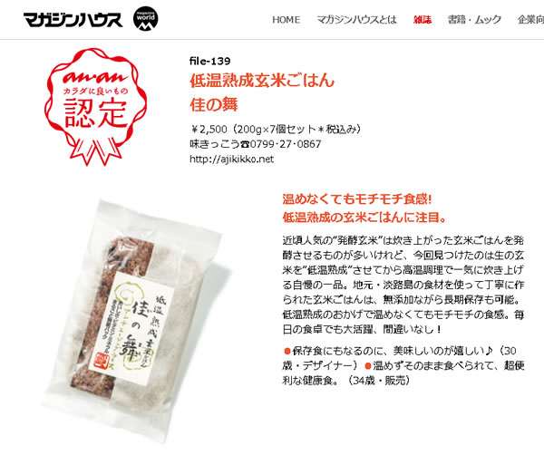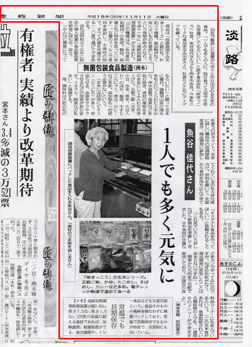| 業種 | 食品製造販売 1.包装パック食品 たこめし・あなごめし・五穀玄米ごはん・淡路島丸ごと朝カレー・赤五穀おこわ・雑穀五穀ごはん・そばめし・牛すじこんにゃく・忍者食シリーズ 2.麺類 わかめそば等 |